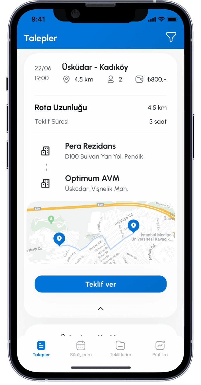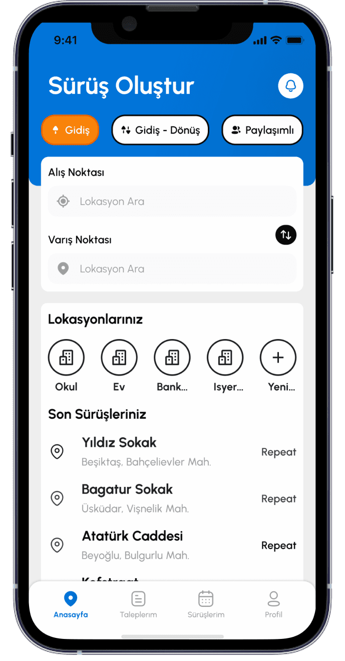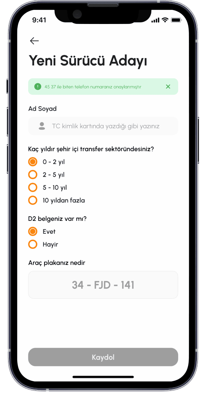Tarafınıza ait Kimlik ve İletişim Verileri Kanun’un 5/2 fıkrasının a ve c bentleri uyarınca Kanundan kaynaklanan işlemlerin yerine getirilmesi ve Sözleşmesel yükümlülüklerin ifası amacıyla işlenecektir. Bu kapsamda ilgili veriler, sürücü başvuru işlemlerinizin uygulama üzerinden alınması, yolculuk kapsamında randevu ve iptal süreçlerinin yürütülmesi ve gerekli bildirimlerin yapılması için Ad-Soyad, TC Kimlik Numarası, Kişisel e-posta adresi, Kişisel Cep Telefonu numarası, paylaşımda bulunduğunuz adres bilgileri işlenecektir.