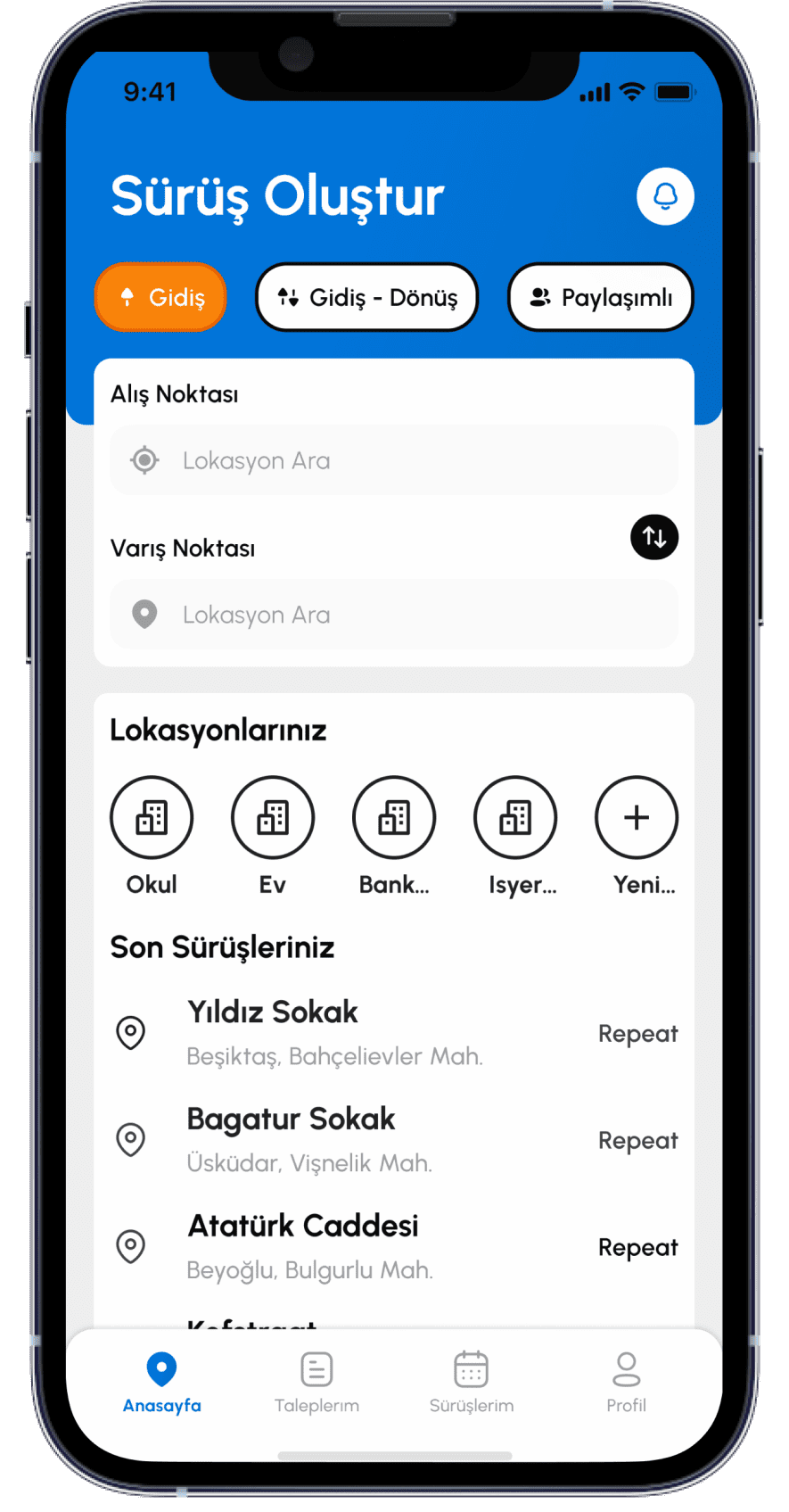 Tarafınıza ait Lokasyon Verileri Kanun’un 5/2 fıkrasının a ve c bentleri uyarınca Kanundan kaynaklanan işlemlerin yerine getirilmesi ve Sözleşmesel yükümlülüklerin ifası amacıyla işlenecektir. Bu kapsamda ilgili veriler, yolculuk hizmetinin verimli ve hızlı bir şekilde sağlanması, hizmet süresince müşteri güvenliğinin sağlanması ve gerekli bildirimlerin yapılması için uygulamanın kullanıldığı sırada mevcut konumunuzu ilişkin lokasyon bilgileri işlenecektir.